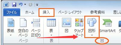 word[挿入]タブ、[図]グループの、[図形]ボタンをクリックし、