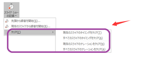 PowerPoint の [スライド ショーの記録] メニュー ボタンの [クリア] コマンド。