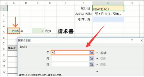 「年」となる数字は、A5番地に入力されているので、引数「年」の欄には「A5」と設定します。