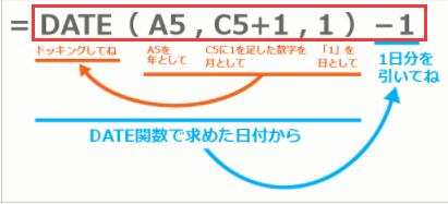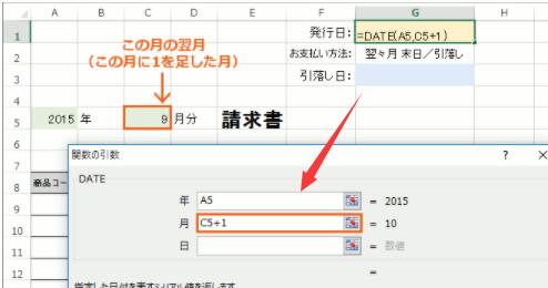 「月」となる数字は、C5番地に入力されていますが、ここで求めるのは、この月の翌月なので、C5番地の1ヶ月後の月となるよう「C5+1」と設定します。