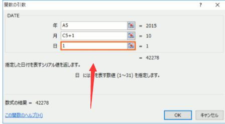 つまり、日は必ず「1日」(ついたち)となってほしいので、引数「日」の欄には「1」と入力します。