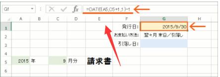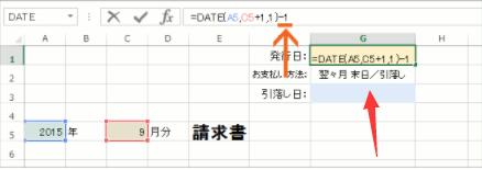 今回はG1番地に、A5番地で指定した「年」と、C5番地で指定した「月」の末日が表示されるようにしてみます!